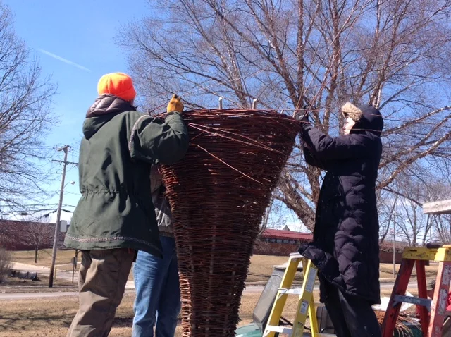 Preparations in the garden began on a cold and blustery March day with the weaving of 4 large willow "flutes." Volunteers were under the direction of master willow weavers Lindsay Lee, Lee Zieke and Mary Kopecky.